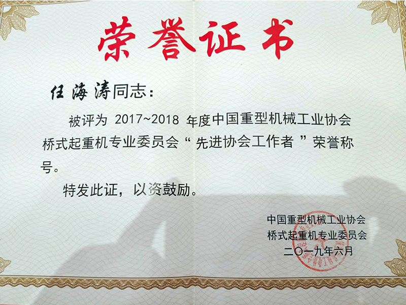 會上,表彰了2018年度全國企業(yè)。河南礦山再次榮獲“門式起重機生產(chǎn)企業(yè)”榮譽稱號,此前,公司已多次獲得該項榮譽;公司總經(jīng)理任海濤榮獲2017-2018年度中國重型機械工業(yè)協(xié)會橋式起重機委員會“先進協(xié)會工作者”榮譽稱號。